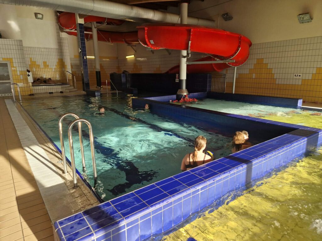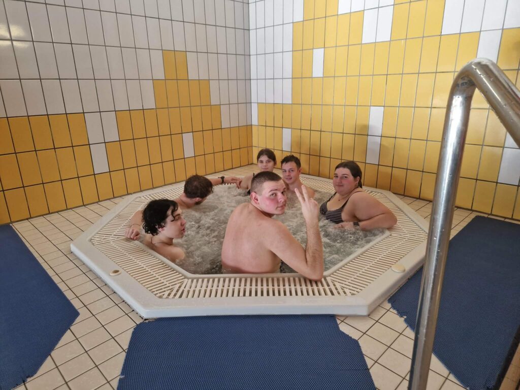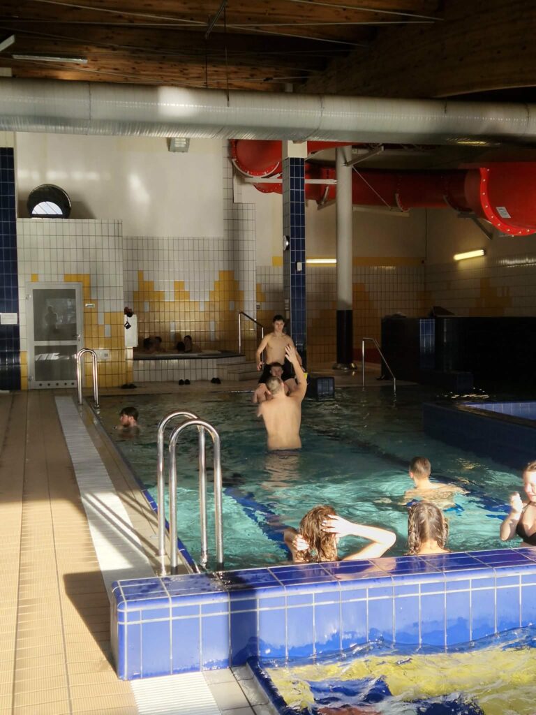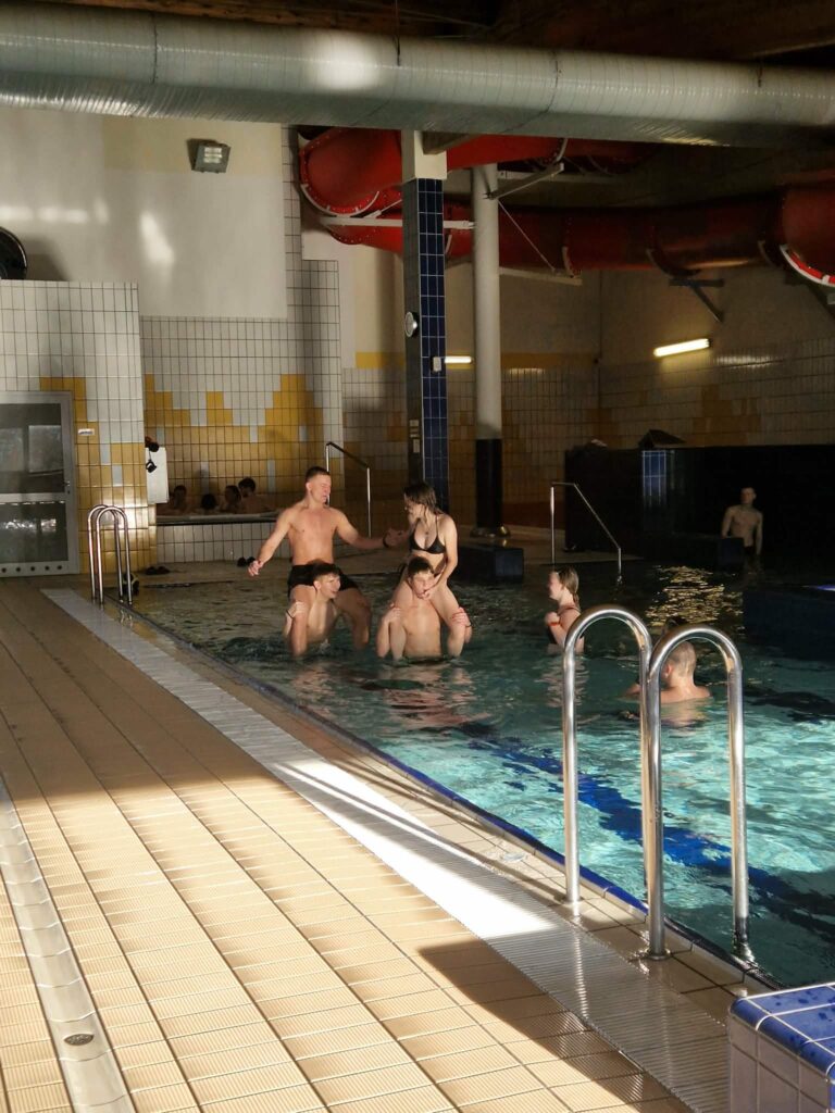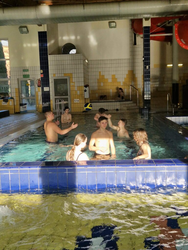 Nasi uczestnicy ostatni przedświąteczny poniedziałek wraz z kadrą wychowawczą spędzili na krytej pływalni w Dąbrowie Tarnowskiej. Podczas dwugodzinnego pobytu na basenie każdy znalazł swoje miejsce i z dużym zróżnicowaniem wykorzystał czas. Część uczestników postawiła na relaks wybierając jacuzzi, zjeżdżalnie lub odbijanie piłki w mniejszym basenie natomiast niektórzy wybrali chłodniejszą wodę i naukę nowych rzeczy w dużym basenie. Pobyt na pływalni ma szereg korzyści prozdrowotnych takich jak wzmocnienie całego ciała, odciążenia stawów, korygowanie wad postawy czy zredukowanie stresu oraz korzyści społeczne takie jak integracja młodzieży, wspólne i aktywnie spędzanie czasu, a także budowanie relacji koleżeńskich.